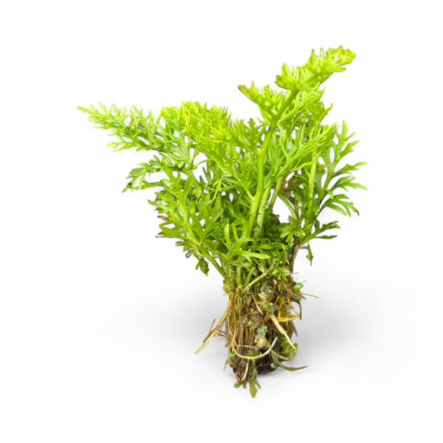 This plant normally grows fast, but the addition of CO2 may be necessary to promote growth. In small, open aquariums, it can grow out of the tank and form beautiful surface leaves. The finely branched leaves are very decorative and provide good contrast to other leaf shapes. In good light Ceratopteris thalictroides grows fast and helps prevent algae by consuming large amounts of nutrients. This makes it a good starter plant in small aquariums. May supplied as cut stems part of the year and will reproduce with pups on the leaves.