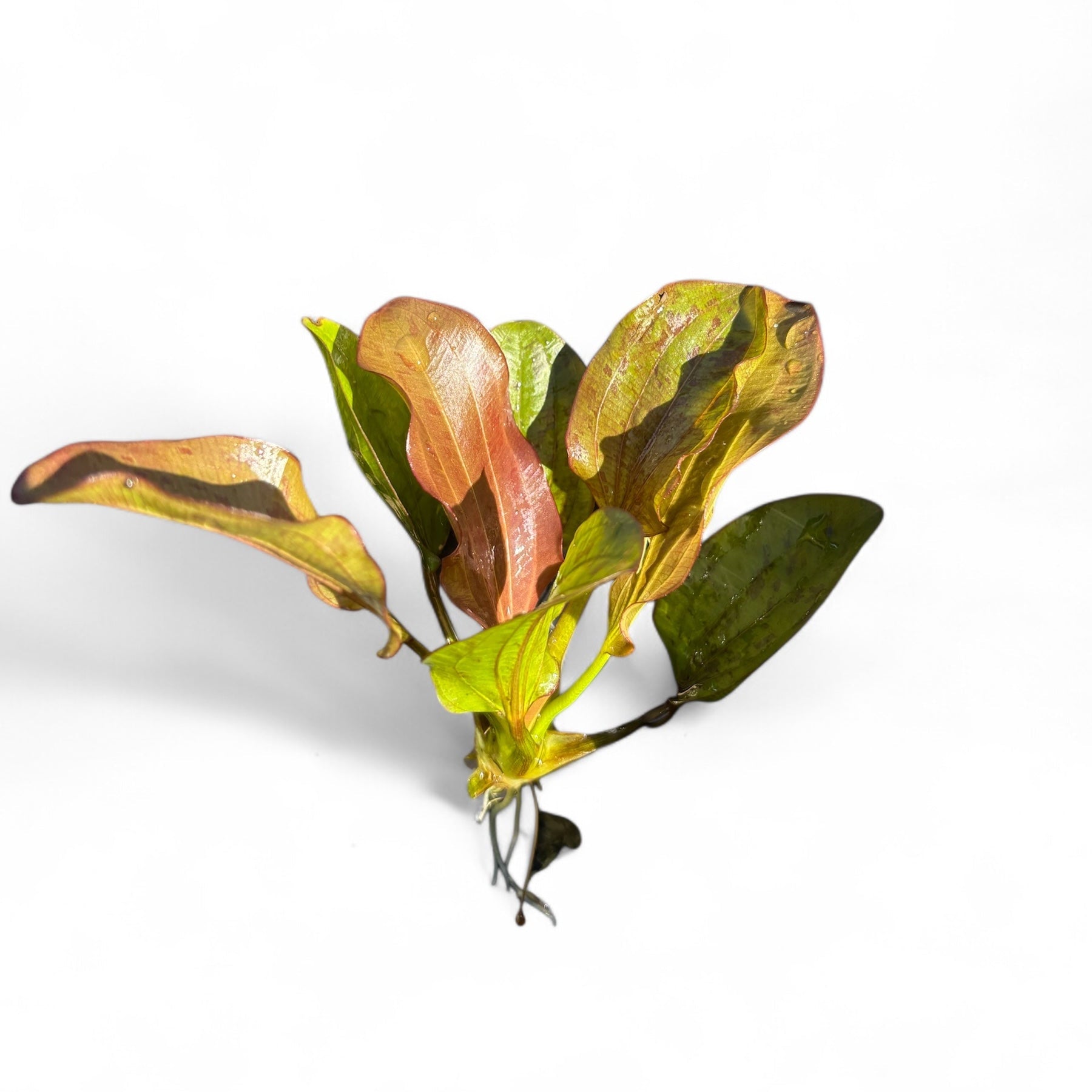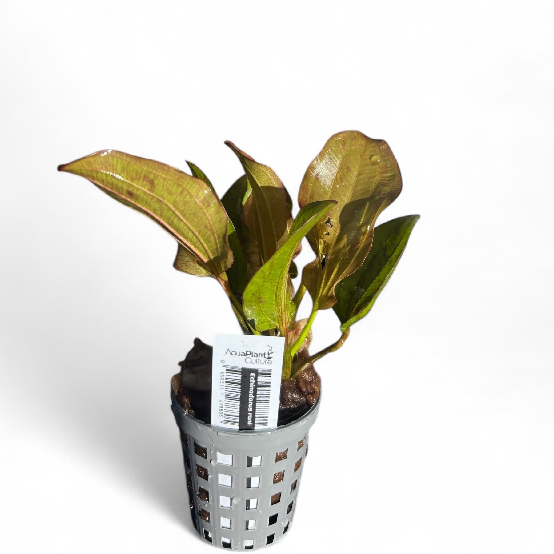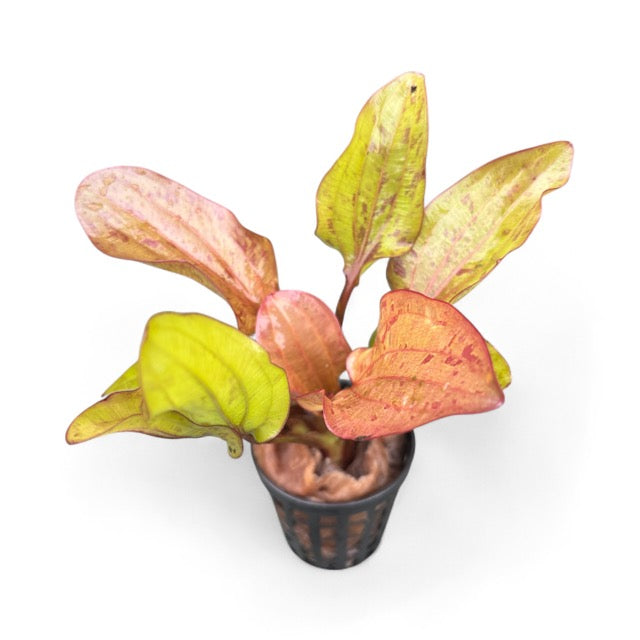Echinodorus Reni is a visually striking aquatic plant known for its unique leaf structure and vibrant coloration. This species features broad, lance-shaped leaves that emerge in a rosette formation, showcasing a stunning mix of green and reddish hues. The leaves are often slightly ruffled along the edges, adding texture and depth to aquascapes.